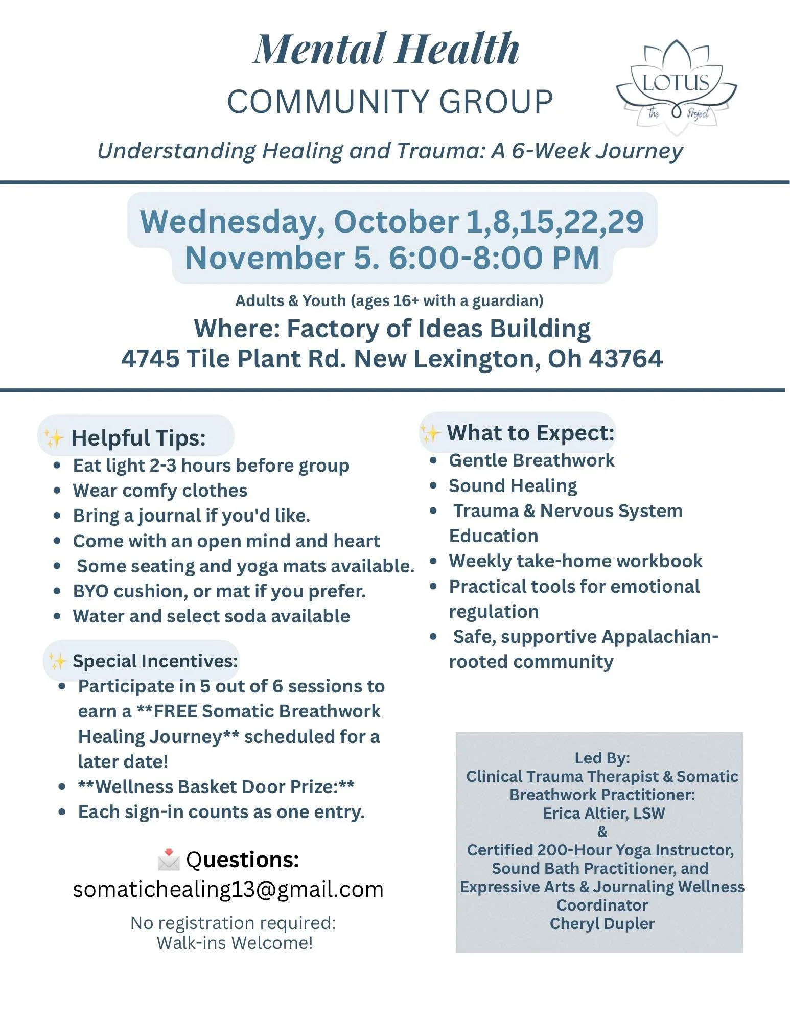 Understanding Healing and Trauma: A 6 week series: Lead by Erica Altier, Trauma Therapist-LSW, Somatic Breath Work Facilitator and Cheryl Dupler, 200 Hr RYT, Sound Bath Practitioner and Expressive Arts Facilitator at The Factory of Ideas in New Lexington.